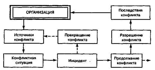 Развитие конфликта проходит в обычных условиях три стадии — предконфликтную, конфликтную и послеконфликтную. Каждая из них в свою очередь делится на фазы. Любую стадию и фазу следует рассматривать всего лишь как определенный этап в движении, динамике конфликта, указывающий на его связь с источником напряженности в социальных отношениях и с противостоянием оппонирующих сторон.