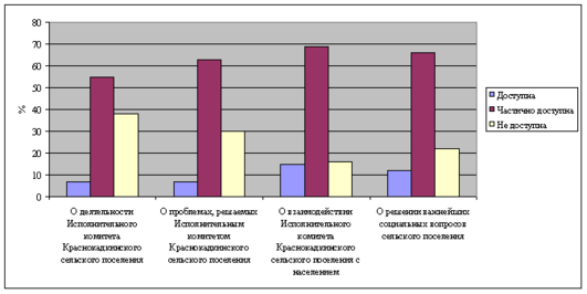 Наименьшую доступность респонденты отметили в отношении информации о взаимодействии Исполнительного комитета Краснокадкинского сельского поселения с населением. 38 % опрошенных отметили, что информация о деятельности Исполнительного комитета Краснокадкинского сельского поселения является недоступной. 30 % респондентов отметили недоступность информации относительно проблем, решаемых Исполнительным комитетом Краснокадкинского сельского поселения.