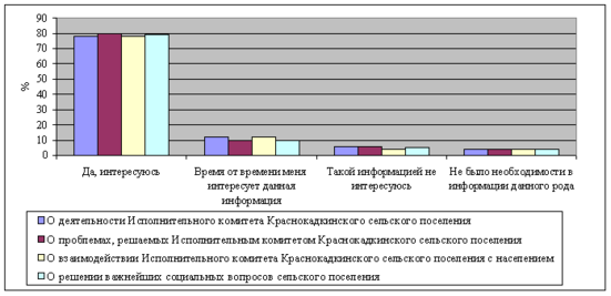 Полученный на основе опроса график показывает, что в целом степень заинтересованности опрошенных относительно деятельности, решаемых проблем и взаимодействия Исполнительного комитета Краснокадкинского сельского поселения с населением достаточно высокая, причем заинтересованность в вопросах, касающихся проблем, решаемых Исполнительным комитетом, является наивысшей.