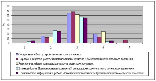 Анализируя ответы на вопрос об оценке работы Исполнительного комитета Краснокадкинского сельского поселения Нижнекамского муниципального района по 5-бальной шкале (1-самая низкая оценка, 5-самая высокая оценка), были получены следующие результаты (рисунок 1).