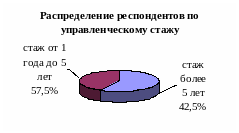 В качестве социально-демографических характеристик руководителей, связанных с исследованием психологических аспектов управления персоналом лечебно-профилактических учреждений, нами использованы следующие параметры: стаж управленческой деятельности, пол руководителей, уровень профессионального образования руководителей (высшее, среднее). Характеристика основных групп выборки представлена на диаграммах.