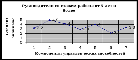 Данные графика свидетельствуют о том, что руководители со стажем работы более 5 лет выделяют, как значимые три компонента управленческих способностей: эмоционально-волевой, социально-коммуникативный и организационный, причем эмоционально-волевой компонент выделяется как наиболее значимый. Наименее значимыми опрошенные руководители со стажем работы более 5 лет считают проектировочный и конструктивный компоненты управленческих способностей. По нашему мнению это происходит вследствие того, что руководители со стажем работы более 5 лет более адаптированы к условиям управленческой деятельности.