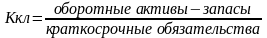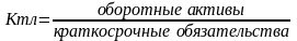 Ктл характеризует платежные возможности предприятия, оцениваемые при условии не только своевременных расчетов с дебиторами и благоприятной реализации готовой продукции, но и продажи при необходимости прочих элементов материальных оборотных средств. Показывает сколько гривен в оборотных активах приходиться на один грн текущих обязательств и характеризует ожидаемую оплатность предприятия на период, равный средней продолжительности одного оборота всех оборотных средств, т.е. достаточно ли у предприятия средств, которые могут быть использованы им для погашения своих краткосрочных обязательств в течение периода. Рассчитывается как отношение стоимости всех оборотных (мобильных) средств предприятия к величине краткосрочных обязательств