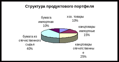 Анализируя внутреннюю структуру предприятия (см. табл.2.1.), а именно продуктовый портфель предприятия, наблюдаем работу принципа Парето -20% продаваемого товара дает 80% прибыли. Оптовая торговля бумагой дает нам 80% прибыли, розничная продажа и канцтовары, отнимают много времени и приносят мало доходов. Также не оптимизирован запас товара на складе, узкий ассортимент неупорядоченный ассортимент товаров, меняется приоритет в предпочтении клиентов (в сторону более дорогих и качественных товаров). Поэтому над ассортиментом продаваемой продукции следует поработать. Общая структура портфеля (рис.2.2.):