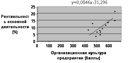 Рис.3.2. Зависимость между рентабельностью основной деятельности и организационной культурой предприятия