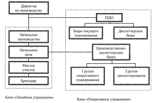 Выполнение указанной функции возлагается на производственно-диспетчерский отдел (ПДО), который состоит из бюро оперативно-календарного планирования и диспетчерского бюро. В составе этих бюро выделяются группы (исполнители), каждая из которых курирует определённый цех или производство.