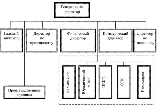 В соответствии с действующими положениями непосредственно на директора предприятия возлагается руководство выполнением отдельных функций: бухгалтерского учёта, технического контроля, правовой деятельности, организация информационно-вычислительных операций, общее делопроизводство. Однако в этом случае происходит превышение норм управляемости для генерального директора, поэтому руководство выполнением вышеуказанных функций распределяем следующим образом: бухгалтерию подчиним финансовому директору. ОТК и юридический отдел - заместителю генерального директора по коммерческим вопросам; общим делопроизводством будет заниматься канцелярия как составная часть секретариата. Тогда окончательная схема блока «Общая руководство» будет выглядеть следующим образом: