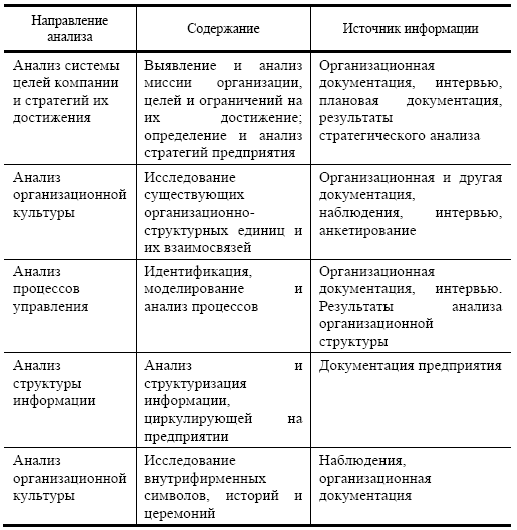 В результате организационно-управленческого анализа устанавливается существующая система реализации бизнес- процессов и управления ими, а также соответствующая им информационно-технологическая модель функционирования предприятия. Анализ определяет проблемные и узкие места предприятия, его организационно-управленческий потенциал, а также формирует цели и подходы организационной реструктуризации.