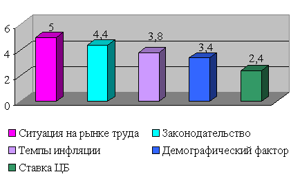 Следующими по степени влияния на эффективность управления персоналом на предприятии являются такие факторы, как темпы инфляции (значимость данного фактора - 3,8) и демографический фактор (значимость данного фактора 3,4).