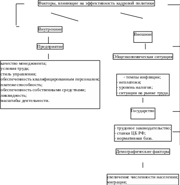 Эффективность управления кадрами зависит от многих факторов, которые можно разделить на внешние, оказывающие влияние вне зависимости от интересов предприятия, и внутренние, на которые предприятие может и должно активно влиять. Эти факторы наглядно иллюстрирует рисунок 2.2.