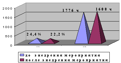 Ликвидируя потери рабочего времени в простоях, с учетом внедрения данного мероприятия, общие потери уменьшатся на 10,2%, (именно эту долю составляют потери рабочего времени этого вида в общей структуре ПРВ) и составят на конец отчетного периода 22,1% (24,4/1,102) вместо 24,4%.