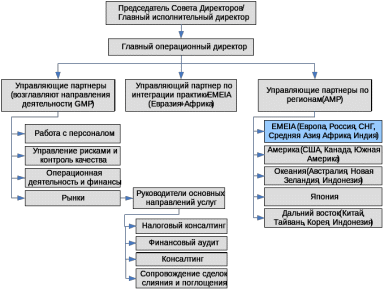 Организационная структура корпорации представляет собой дивизионную структуру с разделением по географическому признаку (рисунок 5). Как было указано выше, глобальная практика компании разделена на пять географических регионов. На Рисунок6 представлена организационная структура ветви EMEIA, включающей в себя все практики Ernst & Young в Африке, Европе, Средней Азии и Индии.