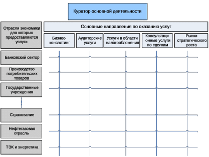 Представленная на Рисунке 7 матрица отражает специфику основной деятельности компании. В компании существуют пять основных направлений оказания услуг, представленные на горизонтальной оси матрицы. По каждому из данных направлений компания предлагает своим клиентам услуги в различных отраслях экономики, перечисленных по вертикали. Таким образом, в компании по каждому направлению деятельности существуют сотрудники, специализирующиеся на какой-либо отрасли, например, специалист по аудиту в области энергетики или специалист по налогообложению в области производства.