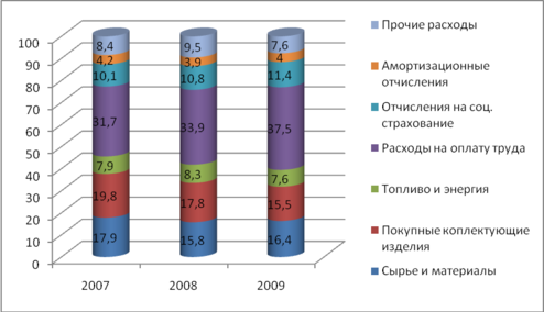 Из приведенных данных таблицы 2.4 и рисунка 6 видно, что основная доля расходов приходится на материальные затраты (в 2009г. 39,5 %) и затраты по оплате труда (в 2009г. 37,5 %), что в совокупности составляет 77 % от всех затрат, понесенных предприятием за отчетный период.