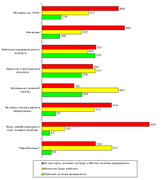 Как следует из Диаграммы, ничто не препятствует использованию труда военнослужащих, уволенных в запас, а также «чернобыльцев». Ряд других категорий - матери-одиночки и многодетные, а также лица предпенсионного возраста - имеют достаточно нейтральный баланс оценок их фактического использования / возможности привлечения к работе на МП. В наихудшем положении - лица, отбывшие заключение, а также молодежь до 18 лет и люди с ограниченными возможностями (инвалиды).
