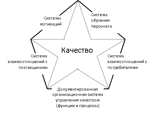 В основание звезды качества положим ту или иную систему управления качеством, соответствующую определенной концепции. Будем предполагать, что система эта документирована и охватывает организационную структуру управления предприятием, а также систему управления процессами создания продукции. Последнее очень важно подчеркнуть: мы рассматриваем организацию и как функциональную структуру, и как совокупность процессов.