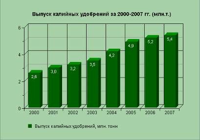 На рисунке 1 представлена диаграмма, показывающая выпуск калийных удобрений за 2000-2007 гг. (млн.т.)