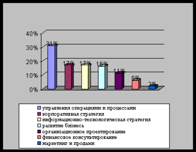 Анализ структуры услуг, производимых управленческими консалтинговыми фирмами в ОАО «Сильвинит» в течение 2007-2009 годов, дал следующие результаты: 31% - консалтинговые услуги по вопросам управления операциями и процессами, включая вопросы реорганизации бизнеса и всеобщего управления качеством, 17% - консультирование по вопросам корпоративной стратегии, 17% - консультирование по вопросам информационно-технологической стратегии, 16% - консультирование по вопросам развития бизнеса, 11% - консультирование по вопросам организационного проектирования, 6% - финансовое консультирование, 2% - услуги по вопросам маркетинга и продажам. Все эти результаты представлены на рис.3: