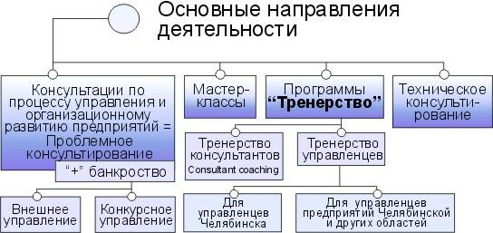 Консультирует по процессу управления и организационному развитию предприятий - менеджмент консалтинг. От появления на свет до исчезновения на предприятии идет процесс развития. Возникают постоянно или время от времени проблемы, решить которые можно эффективно или неправильно. Фирма старается сделать так, чтобы сразу же все управленцы получили одинаковое представление о сложившейся ситуации и все мобилизовались на решение проблемы или все достигли целей. Таким образом, например, через 20 часов работы со всеми сотрудниками, замкнутыми на данную проблему или ситуацию, обязательно находится решение: