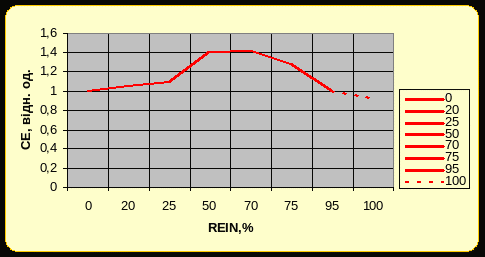 а рис. 1.2. показана найбільш типова залежність між рівнем реінвестування дивідендів (REIN) і курсовою ціною акцій підприємств важкого машинобудування. Курсова ціна акцій приймалася як середня по галузі. Базою для статистичного прогнозування зміни ціни акцій прийняті дані за 1995 – 1997 рр. Показники приймалися в порівняльних цінах 1.