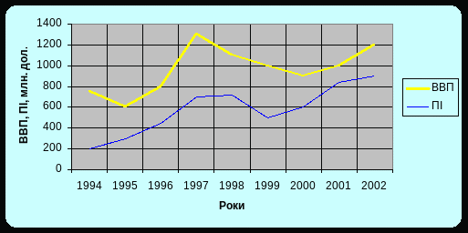 Зростання курсу акцій підприємства обробних галузей свідчить про позитивні структурні зрушення в економіці країни і про посилення уваги з боку інвесторів до високотехнологічних виробництв. Імовірних причин тут дві. Перша: починаючи з 1994 р. почала змінюватись загальна тенденція капіталовкладень – неефективні технології не фінансуються. Друга: високе спрацювання основних виробничих фондів, у тому числі у видобувних галузях, об’єктивно обумовлює посилення уваги до виробництва засобів виробництва. В свою чергу від обсягу інвестицій залежить обсяг ВВП (рис 1.1)