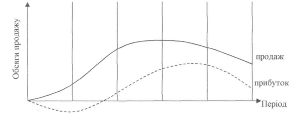 | Рівень продажу | Невисокий | Обсяги продажу швидко зростають і потім стабілізуються | Від стабільного починає зменшуватися | Падає від мінімального до нульового |