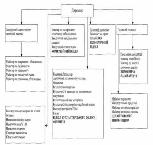 Досягненню цілей і задач служить організаційна структура, без побудови якої не можливо нормальне функціонування підприємства. Вона будується в такій формі, що найбільш ефективно дозволить домогтися Херсонським виноробним заводом поставлених цілей. Організаційна структура Херсонського виноробного заводу представлена на Рис. 9.