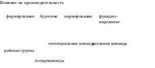 Данная трактовка этапов формирования команды принципиально отличается от ранее нами рассматриваемых. Автор не делает акцент на подготовку и дальнейшую поддержку команды, а остановился только на процессе формирования одновременно с процессом развития команды. Как видно из рисунка 8, каждому этапу формирования соответствует свой этап развития, и кривая указывает влияние развития команды на ее эффективность и производительность. Если рассматривать только процесс формирования без подготовки к нему, дальнейшей поддержки и развития, то данная трактовка наиболее широко описывает этот процесс по сравнению с предыдущими вариантами.
