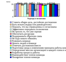Наконец, в последней группе подходов и механизмов создания успешной команды самыми эффективным было отмечено становление общей цели, достойной достижения. Самым неэффективным подходом был указан подход «не трогать то, что уже хорошо», всего 2 балла. На самом деле, здесь практически все подходы и механизмы набрали достаточно высокие баллы – больше 9 баллов, и всего два подхода – низкие.