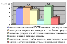 Из числа четвертой группы факторов участники опроса выделили наиболее существенным такой фактор, как «определение препятствий, с которыми может столкнуться команда» – 8,8 баллов. Вторым значимым фактором является «поддержка и направление команды, т.е. содействие процессам» – 8,3 балла. На третье место поставлен фактор «определение цели команды и ожидаемых от нее результатов» – 7,5 баллов. Минимальное влияние оказывает поиск внешних партнеров команды.