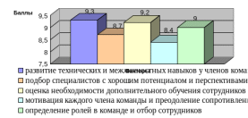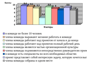 Второй заявленной группой факторов, влияющих на сплоченность команды, были ситуационные факторы. Участники опроса считают, что наиболее значимым фактором является то, что в команде должно быть не более 10 человек – 9,4 балла. Кроме этого, члены команды должны желать работать в команде и быть частью организационной культуры. Чуть менее важным участники опроса считают то, что проект должен представлять собой интересную задачу, которую будет хотеться выполнять членам команды стратегических изменений. Наименее важным фактором является, судя по результатам анкетирования, является то, что члены команды должны работать над проектом полный рабочий день.