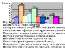 Среди третьей группы предложенных для оценки факторов, участники опроса наиболее значимым фактором для сплоченности команды стратегических изменений считают «выбор: команда или рабочая группа» – 8,2 балла. Можно выделить еще один по значимости фактор, это привлечение спонсора и команды управления для создания команды – 6,8 балла. Остальные факторы получили оценку менее 5 баллов, отсюда следует, что участники опроса считают, что они оказывают минимум влияния на сплоченность команды. Наименее значимым для сплоченности оказалось определение рамок и уровня полномочий команд.