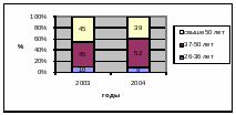 Как видно из рисунка 4, на предприятии наибольшую долю занимают работники с высшим образованием, причем в 2004 году доля работников с высшим образованием растет, что является положительной тенденцией в деятельности предприятия. Как видно из рисунка 5, на предприятии наибольшую долю занимают работники по возрасту старше 50 лет. Однако в 2004 году наблюдается тенденция к сокращению доли работников старше 50 лет и росту доли работников в возрасте от 37 до 50 лет. Таким образом, наблюдается омоложение состава персонала, что является весьма положительной тенденцией.