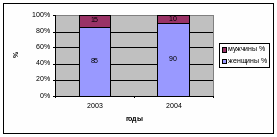 Как видно из рисунка 6, наибольшую долю в общей численности персонала на предприятии занимают женщины (от 85 до 90 %). Причем в 2004 году наблюдался рост доли женщин в общей численности персонала.