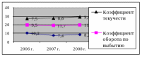 В общей доле работающих большую часть составляют люди с начальным профессиональным - 51,22 %, что свидетельствует о недостаточном образовательном уровне работников. При этом с 2006 года по 2008 наблюдается тенденция изменения удельного веса данной категории на 10% в пользу категории людей со средним профессиональным образованием. Доля людей с высшим образованием остается на уровне 11% от общей численности работающих. Поскольку изменения в качественном составе происходят в результате движения рабочей силы, этому вопросу при анализе уделяется большое внимание. Для характеристики движения рабочей силы рассчитывают и анализируют динамику следующих показателей: