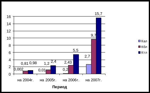 В условиях стабильной экономики Кп должен быть в пределах 0,5-0,7. Но в условиях инфляции, нестабильности платежей предприятие должно иметь более высокую долю собственных средств в структуре активов. Что и наблюдается в нашем случае. Кп в 2005г. повысился на 23,4% относительно 2004г. и на 2,1% в 2006г. по сравнению с 2005г. На это повлияло в 2005г. увеличение суммы собственного капитала на 17,4% относительно 2004г. и снижение стоимости активов на 4,9%. В 2006г. произошло увеличение собственного капитала 25,6% и увеличение активов на 22,1% что привело к незначительному увеличению платежеспособности в 2006г.