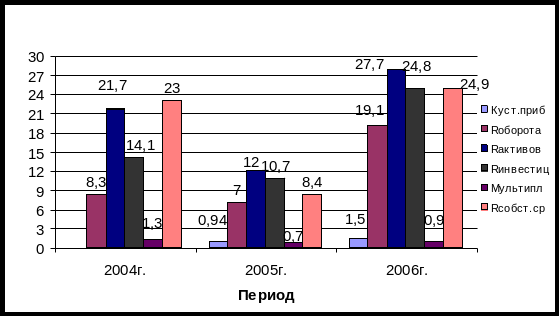 Мультипликатор (26) показывает соотношение собственных и заемных средств в активах предприятия: в 2004г. он составил 1:0,3; в 2005 и 2006г. собственные средства полностью покрыли активы предприятия.