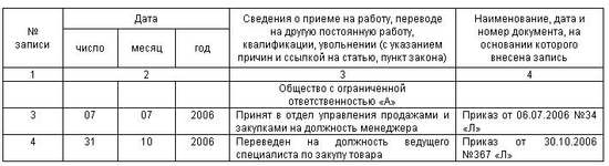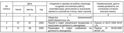 В этом случае в графе 1 ставится порядковый номер записи, в графе 2 указывается дата приема на работу в качестве совместителя, в графе 3 делается запись о принятии или назначении в качестве совместителя в структурное подразделение организации с указанием его конкретного наименования, наименования должности, специальности, профессии с указанием квалификации, в графе 4 указывается наименование документа, на основании которого внесена запись, со ссылкой на его дату и номер.