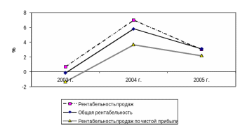 Общая рентабельность достигнута только в 2004 и 2005 годах и составила соответственно 5,8 % и 3,1 %. Рентабельность продаж по чистой прибыли в 2004 году увеличилась на 5 % по сравнению с 2003 годом, а в 2005 году по сравнению с 2004 годом этот показатель уменьшился на 1,5 %.