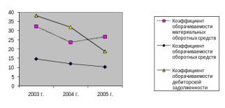 В 2005 году также произошло замедление оборачиваемости оборотных средств. Время оборота оборотных средств увеличилось с 25 дней в 2003 году до 36 дней в 2005 году. По материальным оборотным средствам время оборота в 2005 году увеличилось на 3 дня по сравнению с 2003 годом.
