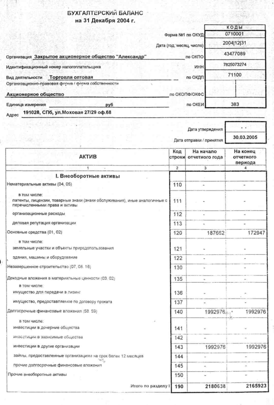 2.1. Оценка риска потери платёжеспособности ЗАО "Александр" осуществляется на основе финансовых показателей в виде коэффициентов платёжеспособности, составной частью которых являются коэффициенты ликвидности. Исходной базой - является бухгалтерский баланс предприятия за 2003 и 2004 год.