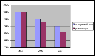 Из приведенных выше данных видно, что за 2005, 2006, 2007 гг. потери от брака снизились на 13 %. В 2006 году по сравнению с 2005 годом, потери от брака уменьшились на 4,41 %, а в 2007 году потери от брака уменьшились на 8,65 % по сравнению с предыдущим годом.