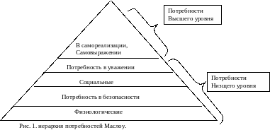 Первые две группы потребностей первичные, а следующие три вторичные. Согласно теории Маслоу, все эти потребности можно расположить в строгой иерархической последовательности в виде пирамиды, в основании которой лежат первичные потребности, а вершиной являются вторичные (рисунок1).