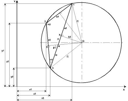 Рисунок 3.4 Определение радиуса ведущего колеса по трём точкам. Расчетная схема.
