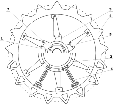 Крутящий момент независимо от направления движения передаётся от ведущего вала конечной передачи 1 через ведущую ступицу 2 на упругий элемент 5, и через него на зубчатый венец 4 и, вследствие взаимодействия последнего с гусеницей и почвой, реализуется в тяговое усилие колеса. Передача крутящего момента осуществляется за счет того, что за счёт того, что с одной ведомой ступицей 3 связаны два упругих элемента, расположенных противоположно друг другу относительно оси ведущего колеса, которые создают усилие направленные в центр колеса, благодаря чему ведомая ступица 3 остаётся неподвижной и каждый из упругих элементов 5 работает как жесткая спица. При наезде на неровность (см. рисунок 3.2) зубчатый обод перемещается вверх, упругий элемент 5 проворачивается вокруг оси шарнира нижней опоры с ведущей ступицей 2 и вокруг оси шарнира верхней опоры с зубчатым ободом 4. Ведомая ступица при этом совершает плоско-параллельное перемещение по направляющим упора-втулки 7 в плоскости, перпендикулярной продольной оси вала, чем и обеспечивается свободный ход зубчатого обода. Подрессоривание при этом реализуется за счёт упругой деформации элементов 5 в плоскости, параллельной продольной оси вала. Деформация каждого из выше обозначенных элементов тем больше, чем ближе элемент к вертикальному положению, то есть своего максимального значения достигает в момент, когда шарниры крепления упругого элемента к зубчатому ободу и ведущей ступице расположены на одной линии, строго перпендикулярной поверхности качения. Исходя из вышесказанного следует, что динамические возмущения воспринимают все упругие элементы 5 конструкции, а в случае «открытого» исполнения к ним также присоединяются и упругие элементы 6. Гашение колебаний осуществляется за счет сил трения в шарнирах креплений упругих элементов 5 к другим деталям конструкции, сил трения между ведомыми ступицами 3 и упором-втулкой 7, а также за счет сил упругости, возникающих в элементах 5.