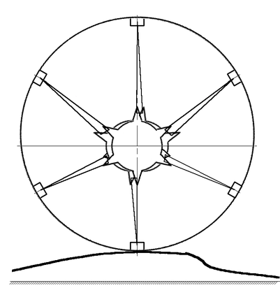 Упругие элементы 6 числом равные числу упругих элементов 5 и расположенные в плоскости, параллельной оси вращения колеса, установлены для компенсирования действия сил боковой нагрузки Данные элементы могут быть заменены защитным кожухом, напрямую соединяющем ведущую ступицу 2 с зубчатым ободом 4, и также выполняющему роль компенсатора боковых возмущений.