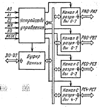 Канал С может быть представлен в виде двух 4-разрядных каналов ввода/вывода, доступ к которым производится как к отдельным независимым каналам. Периферийные устройства подключаются к каналам А, В, С, а связь с микропроцессором осуществляется с помощью шины D через буфер данных. Структурная схема КР580ВВ55А представлена на рис 10.