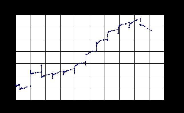 В течение времени измерений, данные об изменении частоты фиксировались каждые пять минут. Характерный ход зависимости частоты поверхностно-акустической волны от времени представлен на рис. 17. Как видно из данной зависимости, частота ПАВ преобразователя первоначально имеет тенденцию увеличиваться. Увеличение частоты поверхностно-акустической волны за первые 20-30 минут наблюдений составило порядка 2 – 2.5 кГц. По прошествии этого времени частота колеблется в гораздо более низких пределах. Изменения частоты в это время происходят в пределах нескольких десятков герц. Небольшой рост частоты объясняется нагревом кристалла кварца нагревающимся в процессе эксперимента ВЧ усилителем Ч3-63. Разные значения установившихся частот поверхностно-акустической волны объясняются различной температурой в помещении.