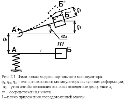 Модель портального манипулятора МРЛ-901П представлена на рис. 2.1. Деформирующимися элементами в манипуляторе являются: зубчатый ремень, обозначенный пружиной; консольная часть, на которой имеется сосредоточенная масса m. Деформация поперечной консоли обозначена на схеме углом
