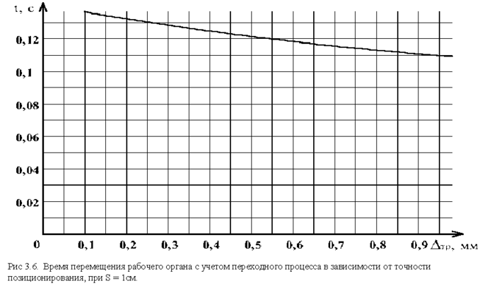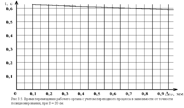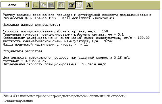 Для практического использования динамической модели при разработке технологических процессов, вычисления главных параметров – времени переходного процесса и оптимальной скорости позиционирования, используются выражения (2.33) и (3.19), которые были использованы при создании программы “Mrl” (см. рис. 4.4).